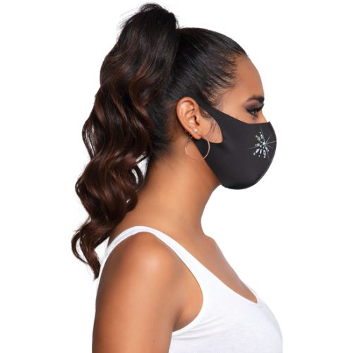 La máscara reutilizable en 3D Fleur presenta un hermoso patrón de flores de strass. El hermoso strass AB en toda la superficie ofrece un brillo iridiscente que te hará destacar entre la multitud.