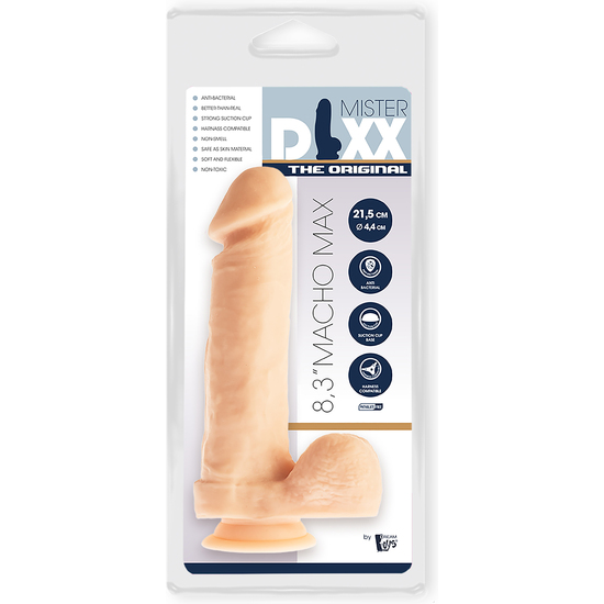 MR. DIXX MACHO MAX 8.3INCH DILDO. Macho Max de la colección Mr Dixx – The Original es un consolador suave y flexible, hecho de PVC antibacteriano, sin olor y seguro para el cuerpo. Max se siente como la cosa real y tiene una fuerte ventosa que permite a los usuarios disfrutar de una variedad de posibilidades para todo tipo de placer, solo o con un compañero. La base de ventosa asegura que Max se pegará a cualquier superficie lisa y plana, ya sea el piso, la cabecera de la cama o la pared de la ducha. Gracias a la ventosa, el consolador también se puede usar en un arnés, asegurando que se mantenga firmemente en su lugar cuando se coloque a través del anillo O, para que el usuario pueda disfrutar de este Mr Dixx sin preocupaciones. Macho Max tiene un eje recto, una cabeza de pene muy distinta y se mantiene orgulloso y fuerte. ¡Puede tentarte y complacerte como un profesional y sin duda te dará un placer intenso! Consolador flexible con sensación real Ventosa fuerte Compatible con arnés Hecho de PVC antibacteriano Libre de ftalatos y látex, sin olor, seguro para el cuerpo Longitud 21,5 cm Ancho 4,4 cm. Medidas de la caja: 30 x 14 x 7. Longitud del producto en cm.: 21. Color: Carne. Material: PVC
