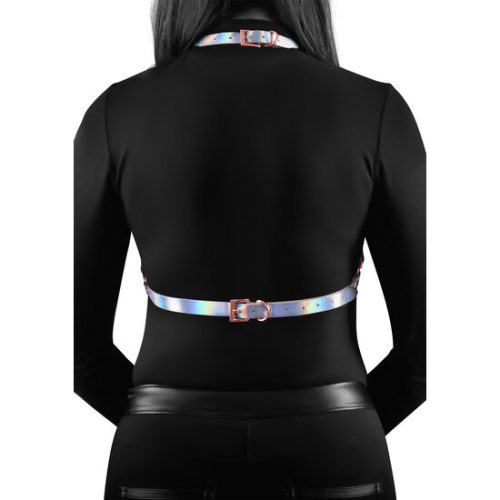 El pecho es de encaje y con forma triangular y el centro es de cinta de raso la cual se alarga y son los tirantes que se atan por detrás del cuello. En el centro del pecho tiene un lazo de adorno y cinta de raso contorneando todo el diámetro.