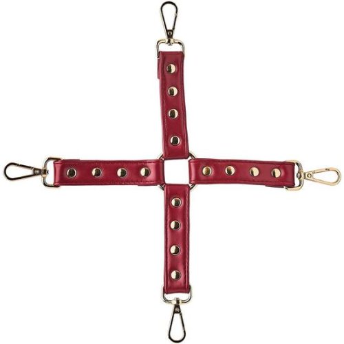 BLAZE ELITE HOGTIE RED. Esta hog tie de la colección Blaze Elite está hecha de cuero artificial rojo con detalles metálicos de color dorado que la hacen lucir atrevida y elegante. Mejora tu juego de bondage con una hog tie para sujetar los brazos y las piernas de tu sumiso. Las 4 ganchos mosquetón se pueden usar para conectar cadenas, cuerdas, esposas, tobilleras y otros accesorios de bondage, por ejemplo, las tobilleras y muñequeras a juego de la colección Blaze Elite. Hog tieHecho de cuero artificial rojoCon detalles metálicos de color dorado, libre de níquelCon 4 ganchos de broche. Medidas de la caja: 20 x 9 x 5. Longitud del producto en cm.: 28,5. Color: Rojo. Material: PU / Metal
