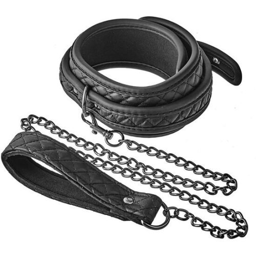 BLAZE COLLAR LEASH DIAMOND BLACK. Este conjunto de collar y correa de la colección Blaze de productos de bondage tiene un diseño acolchado con puntada de diamante negro en cuero vegano, con hardware libre de níquel negro. Para mayor comodidad al usarlo, el collar está forrado con un neopreno suave y duradero. El collar con correa es una necesidad para todos los amantes del bondage y es popular entre aquellos que aman un poco de juego de roles en sus sesiones BDSM.Collar y correa de cuero vegano y metalForrado con neopreno acolchadoEl hardware negro es libre de níquelAjustable completamente con el sencillo cierre de cinturónConectado a una cadena negra extraíble. Medidas de la caja: 21 x 12 x 6,5. Longitud del producto en cm.: 104. Color: Negro. Material: Metal / Neoprene / PVC / PU