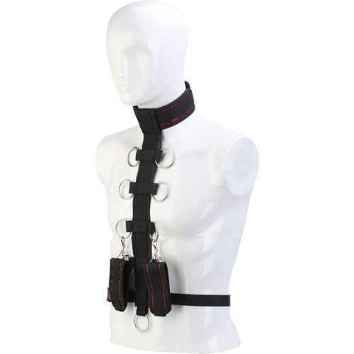 BLAZE DELUXE COLLAR BODY RESTRAINT. Arnés de restricción corporal con cuello y puños desmontables, cada uno con decoración bordada roja. El arnés se puede usar en la parte delantera o trasera del cuerpo. El cuello y los puños se pueden ajustar en tamaño con cierres de Velcro y son cómodos de usar. La banda de la cintura también se puede ajustar con un cierre de hebilla. Con ganchos de mosquetón, los puños se pueden conectar a cualquiera de los 9 anillos O, que también son adecuados para conectar otros accesorios BDSM como cadenas o pesos adicionales.. Medidas de la caja: 21,2 x 13,3 x 8. Longitud del producto en cm.: 49. Color: Negro. Material: Nylon / Iron / ABS / Neoprene